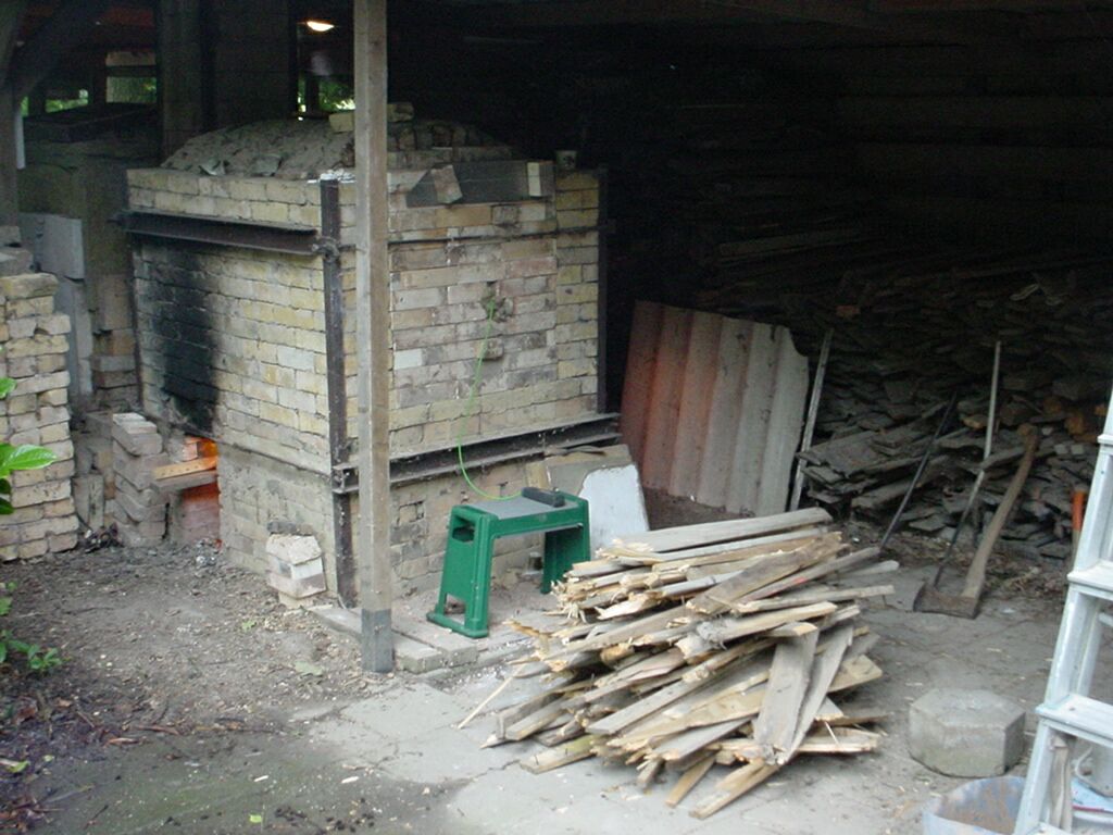 Dit was de laatste houtoven, die de schoorsteen deelde met de gasoven op de achtergrond. Model fastfire van Fred Olsen. Deze houtoven is de verlengde versie van de oven op de tekening. Dat wil zeggen dat in deze oven twee platen 40x40 liggen (op de tekening anderhalve plaat). De hele oven is dus een volle steen verlengd. Inwendige maten zijn ongeveer br75xle90xho75. Schoorsteen ongeveer 3 meter (minimaal 3xinterne hoogte oven). De oven wordt gevuld met biscuit-gestookt werk om tijd te sparen. Als ik hierin met rauw werk moet beginnen, duurt de hele stook te lang voor mij alleen. Nu duurt een sodastook ongeveer 11-12 uur. Lang genoeg als je in je eentje bent...