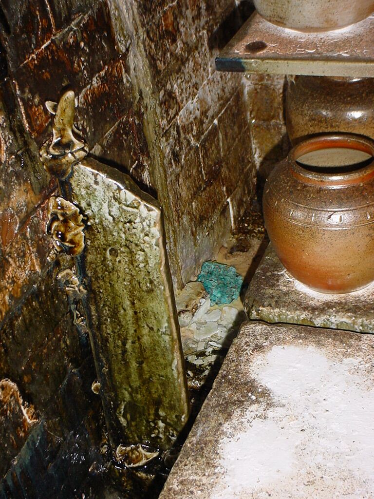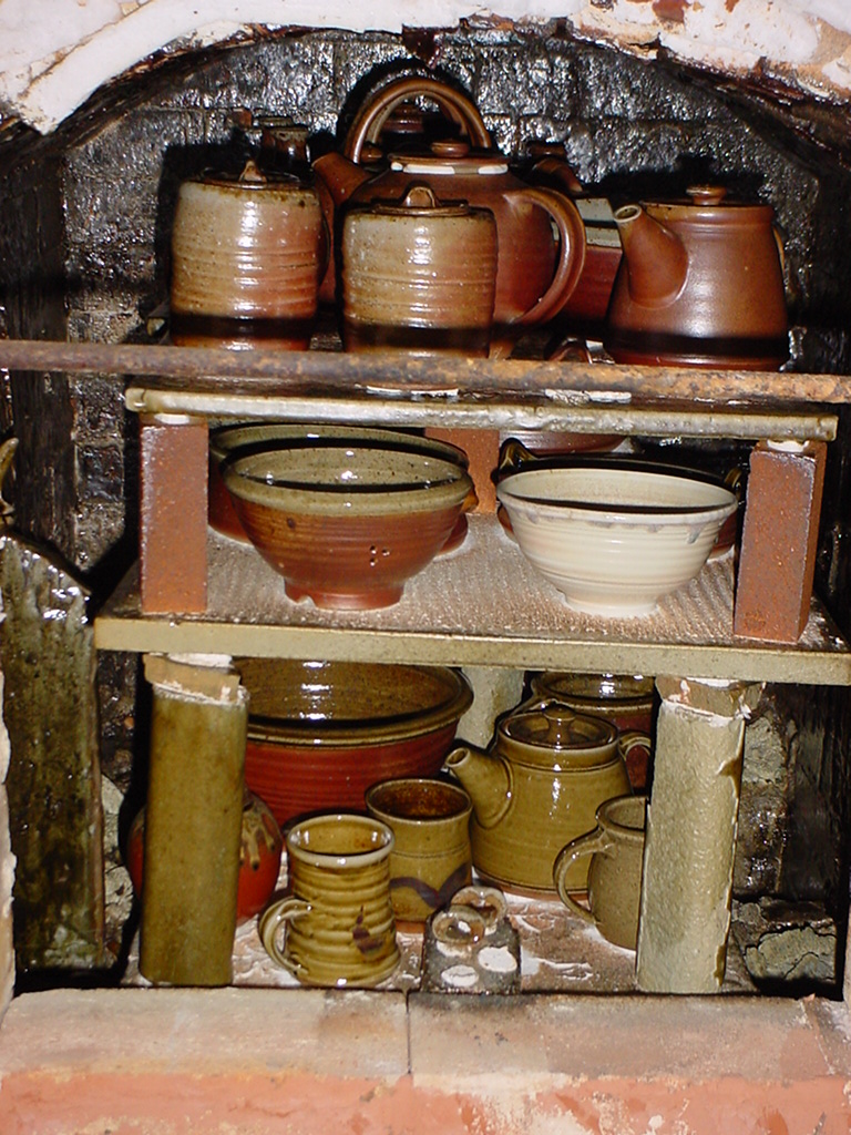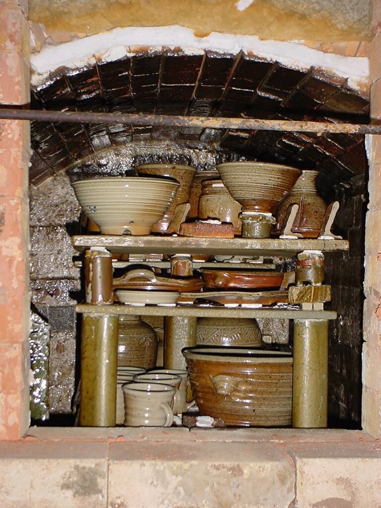 Bij zout-/sodaglazuur staan alle potten op propjes omdat ze anders vastbakken: het glazuur gaat als damp door de oven en alles wordt dus geglazuurd, ook de ovenplaten en de wanden. Rechts een paar foto's uit de oven en tijdens het stoken. In het midden het resultaat van een paar keer zout en soda toedienen op de oven zelf... |