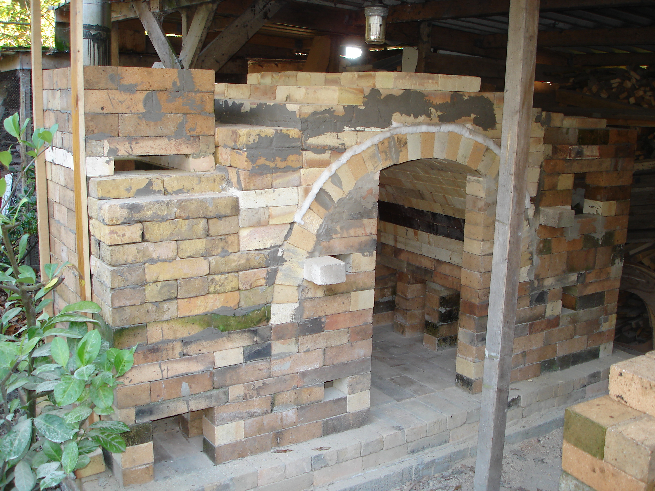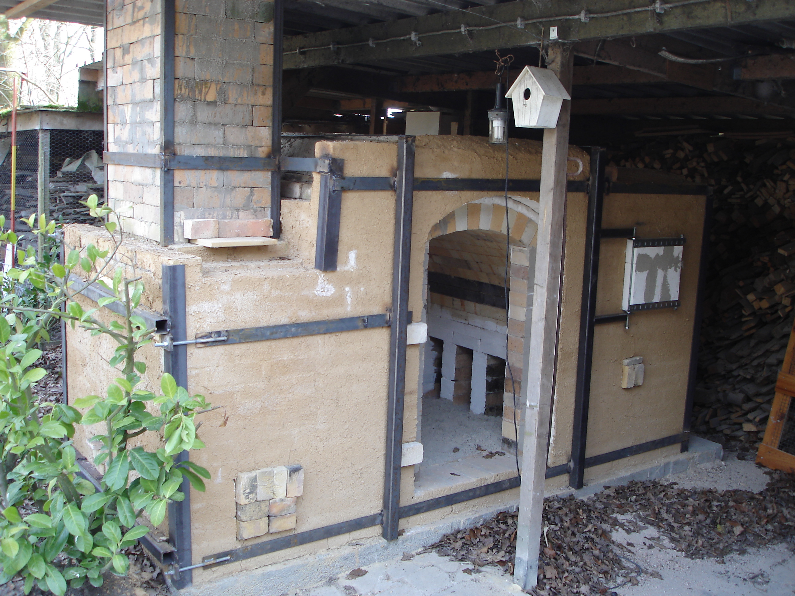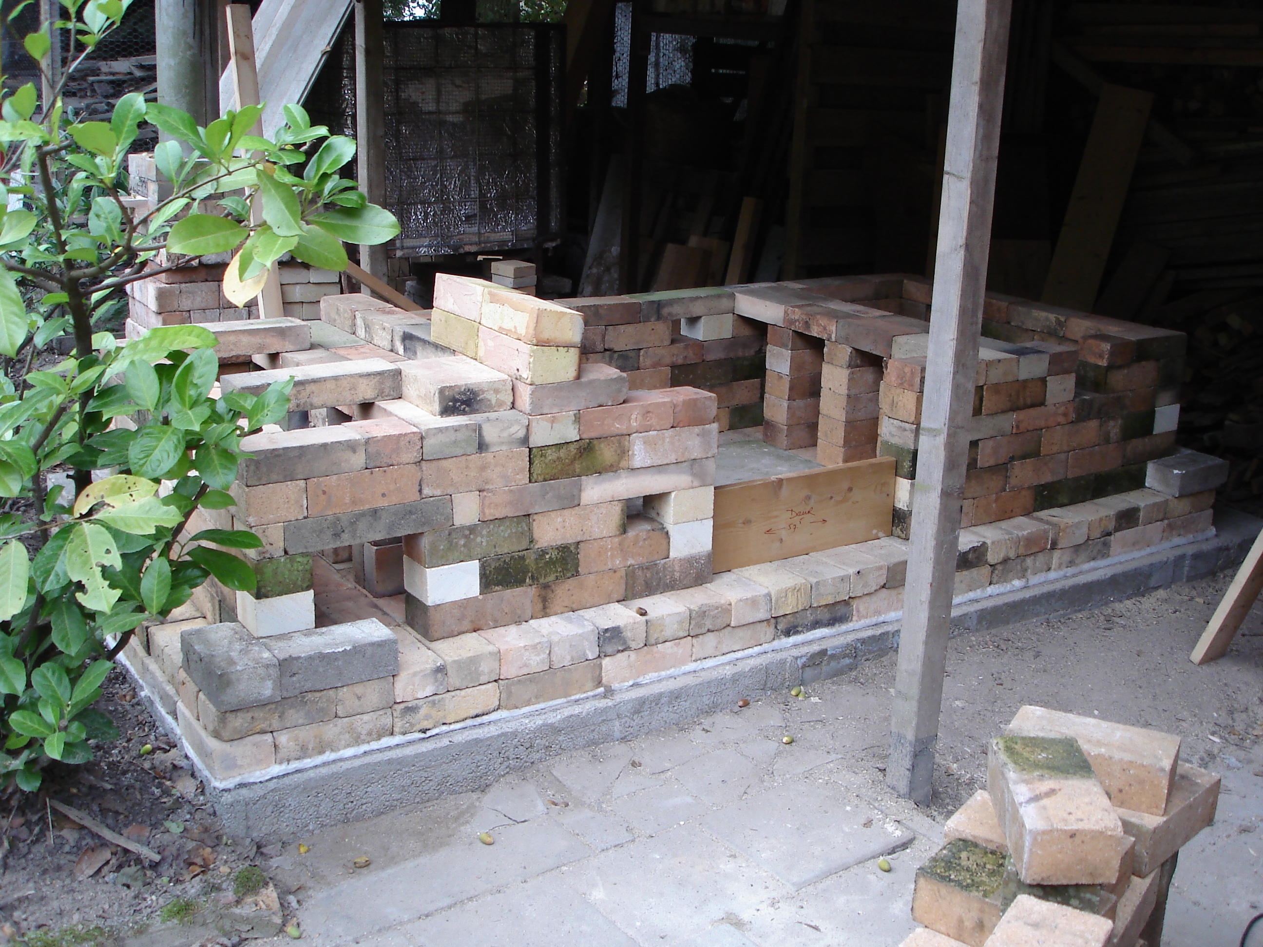 In de winter van 2012/13 heb ik de fastfire houtoven gesloopt omdat hij te slecht werd om nog in te stoken, met name door het vele zoutgebruik.Zout is nu eenmaal heel agressief voor het oven-interieur. Na enige overpeinzingen heb ik besloten om, in navolging van Paulien en Her in Friesland, ook een sasukenei ('don't worry') te bouwen. Een tekeningetje van dit type oven zie je op Sasukenei Paulien&Her. Omdat de toogstenen, die ik nog had liggen, een perfecte halve cirkel vormen is deze oven zo'n 20 cm korter (ovenruimte) en heb ik niet overal wanden van een hele steen (23 cm) tussen de stookruimte, de ovenruimte en de schoorsteen gemaakt, maar steeds slechts een halve steen (11 cm) om ruimte te sparen onder mijn afdak. Ook heb ik, om gewicht aan stenen te sparen, de bovenste twee meter van de schoorsteen met een stalen pijp gemaakt. Op de foto's de diverse stadia van de bouw. In augustus 2013 was het dan eindelijk zo ver: de eerste stook. Het was de bedoeling om minstens 40 uur te stoken om zo veel as-neerslag te krijgen, maar na een uur of 30 zag het er naar uit dat dit punt al bereikt was. Dus gestopt en alles dichtgemaakt. Net daarvoor gaf een van de drie pyrometers nog 1340 graden aan, warm genoeg dus. De oven stookte heel plezierig, al was ook hier een periode van meer dan een uur dat de temperatuur niet wilde stijgen. Gewoon doorstoken en op een bepaald moment gaat de temperatuur dan toch weer omhoog. Er ging ongeveer vier kuub vurenhout doorheen. Wachten tot een oven geopend kan worden, is een van de moeiljkste dingen. In dit geval dus van zaterdagmiddag tot donderdagavond... Toen was hij eindelijk onder de tweehonderd graden. Hieronder een paar plaatjes van de resultaten.