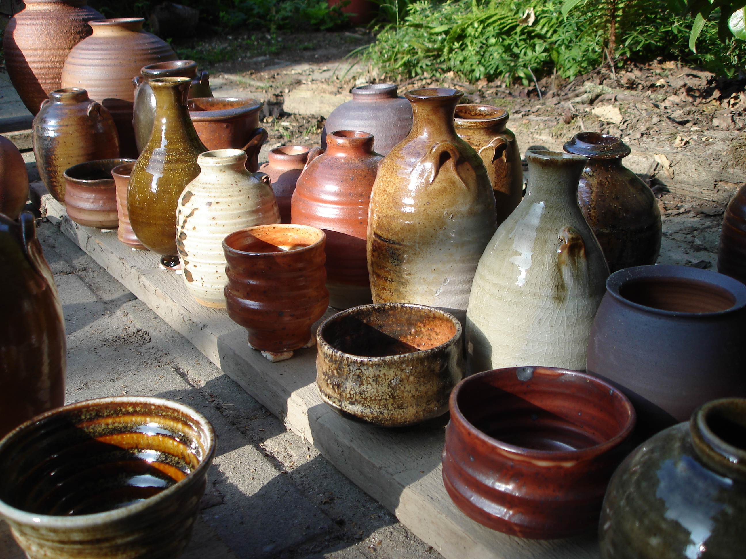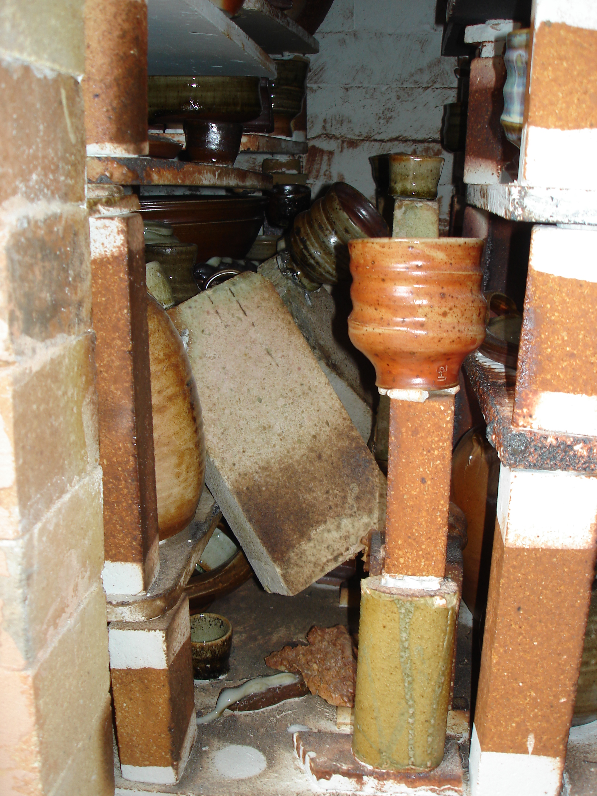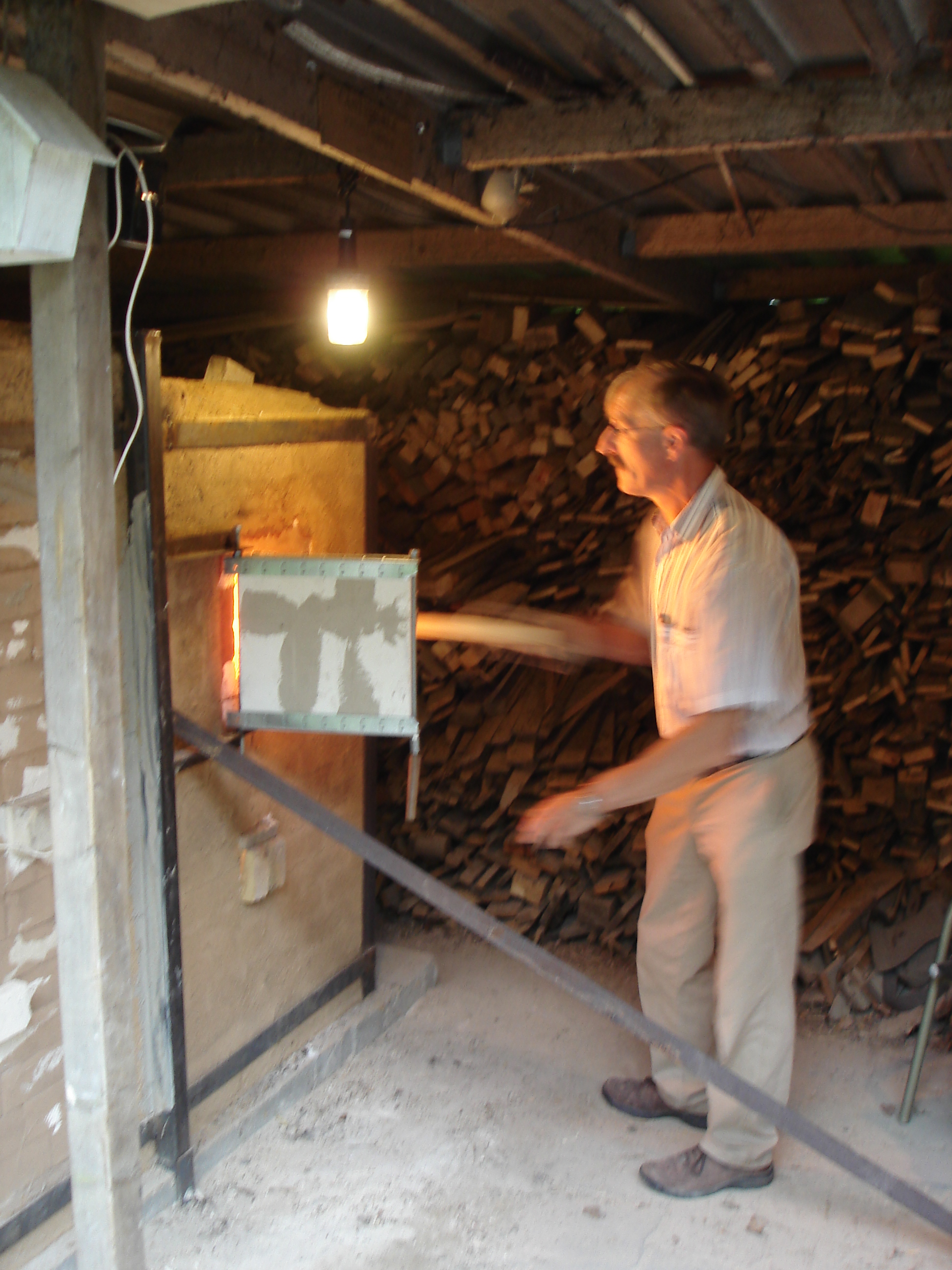 In de winter van 2012/13 heb ik de fastfire houtoven gesloopt omdat hij te slecht werd om nog in te stoken, met name door het vele zoutgebruik.Zout is nu eenmaal heel agressief voor het oven-interieur. Na enige overpeinzingen heb ik besloten om, in navolging van Paulien en Her in Friesland, ook een sasukenei ('don't worry') te bouwen. Een tekeningetje van dit type oven zie je op Sasukenei Paulien&Her. Omdat de toogstenen, die ik nog had liggen, een perfecte halve cirkel vormen is deze oven zo'n 20 cm korter (ovenruimte) en heb ik niet overal wanden van een hele steen (23 cm) tussen de stookruimte, de ovenruimte en de schoorsteen gemaakt, maar steeds slechts een halve steen (11 cm) om ruimte te sparen onder mijn afdak. Ook heb ik, om gewicht aan stenen te sparen, de bovenste twee meter van de schoorsteen met een stalen pijp gemaakt. Op de foto's de diverse stadia van de bouw. In augustus 2013 was het dan eindelijk zo ver: de eerste stook. Het was de bedoeling om minstens 40 uur te stoken om zo veel as-neerslag te krijgen, maar na een uur of 30 zag het er naar uit dat dit punt al bereikt was. Dus gestopt en alles dichtgemaakt. Net daarvoor gaf een van de drie pyrometers nog 1340 graden aan, warm genoeg dus. De oven stookte heel plezierig, al was ook hier een periode van meer dan een uur dat de temperatuur niet wilde stijgen. Gewoon doorstoken en op een bepaald moment gaat de temperatuur dan toch weer omhoog. Er ging ongeveer vier kuub vurenhout doorheen. Wachten tot een oven geopend kan worden, is een van de moeiljkste dingen. In dit geval dus van zaterdagmiddag tot donderdagavond... Toen was hij eindelijk onder de tweehonderd graden. Hieronder een paar plaatjes van de resultaten.